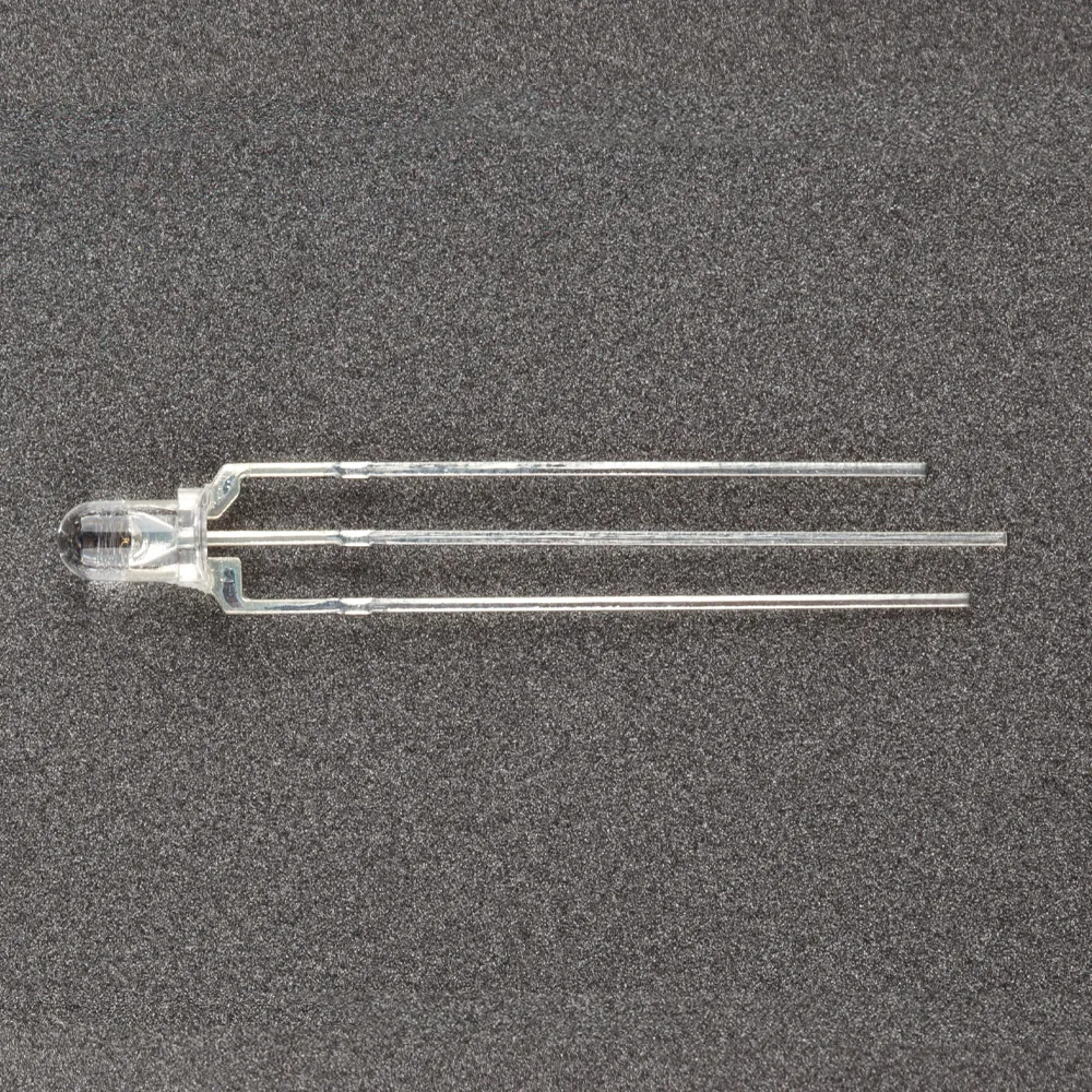 Поставка под заказ от 5000 шт. Выводной круглый светодиод, d=3 мм, прозрачная линза. Цвет свечения красный (625 нм), зеленый (565 нм). Угол излучения 20°. Сила света Iv=100-500 мкд при If=20 мА. VF=1.8-2.4 В. Три вывода, общий катод.