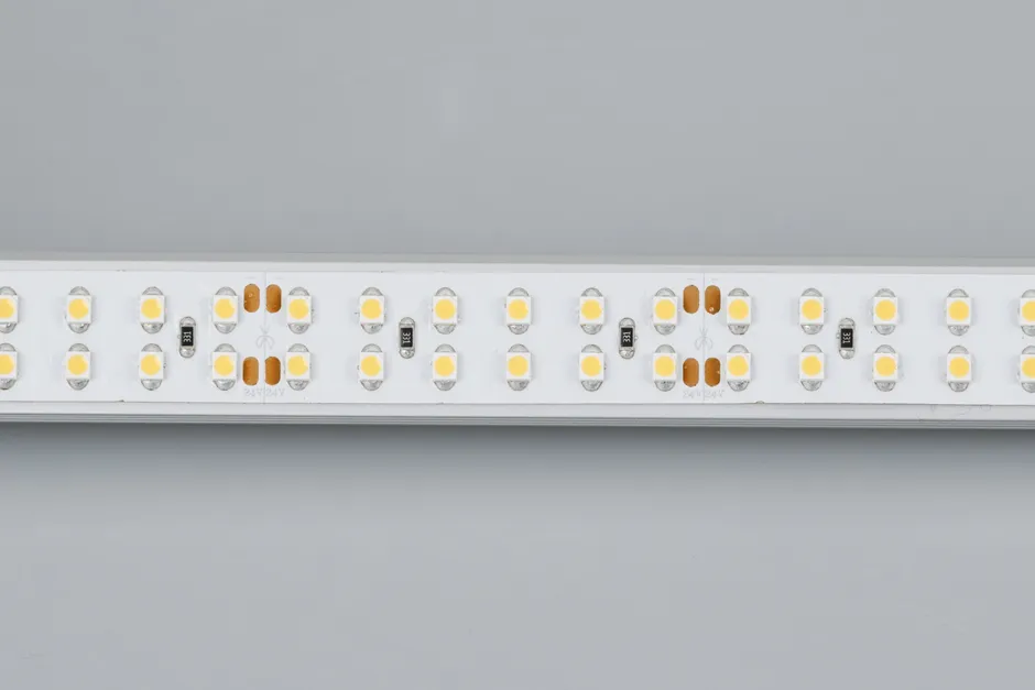 Широкая гибкая лента, светодиоды 2x2 (2 ряда) smd 3528, 240шт/м (1200шт на 5м), белая плата 15мм, скотч 3М. Цвет ТЁПЛЫЙ 2600-2800K.Цветопередача CRI 95..98 Питание 24В, мощность 19,2 Вт/м (96 Вт на 5м), угол 120°. Размеры 5000x15x2,4мм. Мин.отрезок 50мм (12 LED). Цена за 1м.