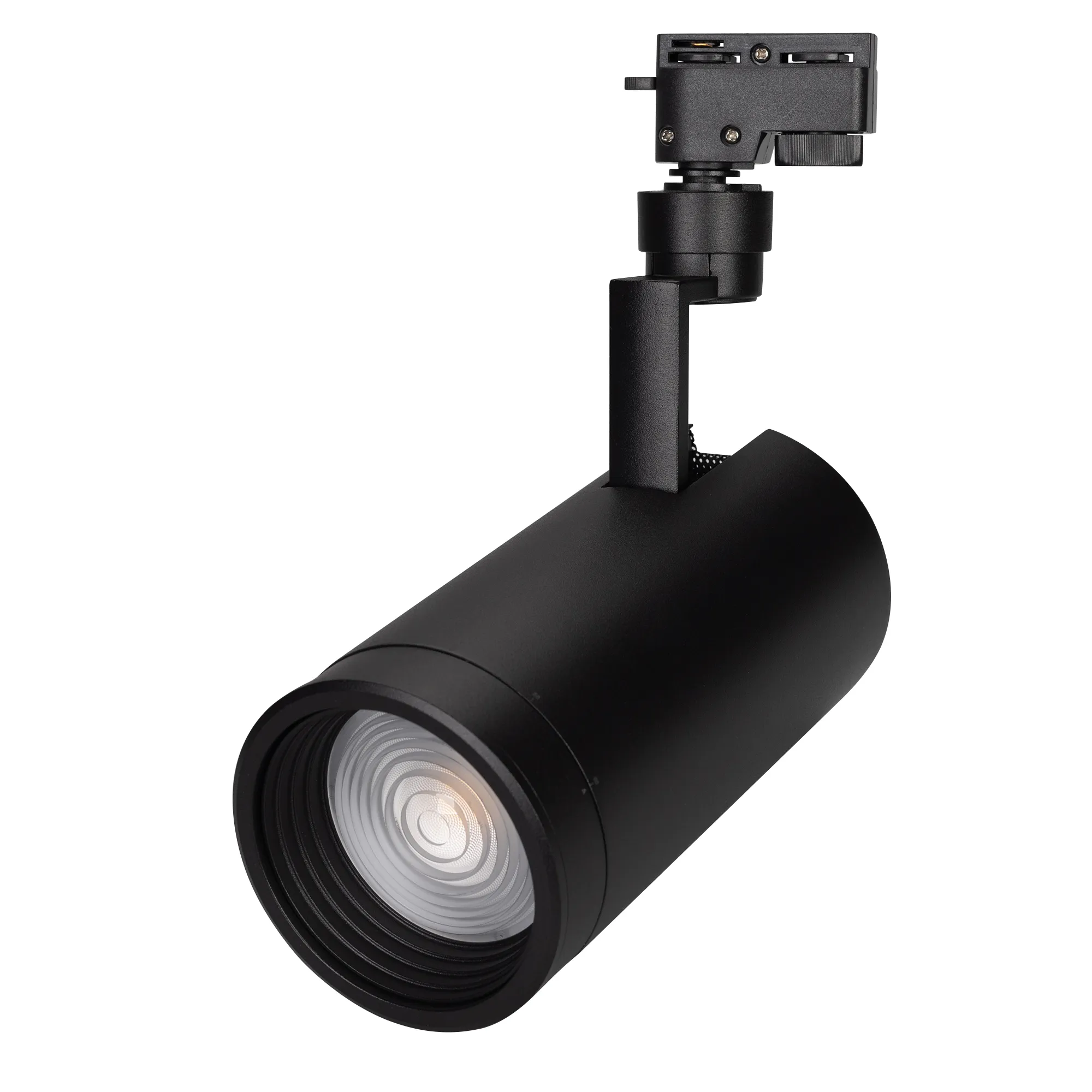 Поставка под заказ от 100 шт. Светильник подвесной для треков/шин 2 провода, 30Вт. Цвет свечения ДНЕВНОЙ 5000K, световой поток 2400-3000лм, регулируемый угол 20-60°, CRI>90. Корпус круглый, металл, цвет черный, IP20. Размеры DxHxL Ø100x220x180мм. Входное напряжение AC220-240V, мощность 30Вт. Драйвер встроенный (30-40V, 750mA).