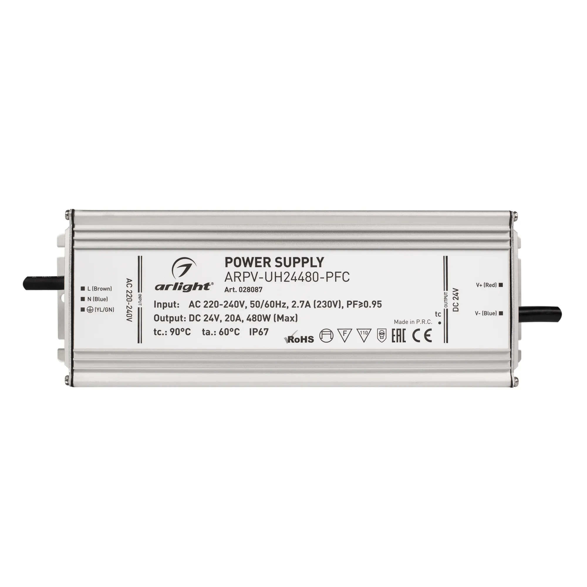Источник напряжения с гальванической развязкой для светодиодных изделий. Входное напряжение 220-240 VAC. Выходные параметры: 24 В, 20 А, 480 Вт. Встроенный PFC >0,95. Герметичный алюминиевый корпус IP 67. Рабочая температура -40…+70C⁰. Габаритные размеры длина 251 мм, ширина 90 мм, высота 41.5 мм. Гарантийный срок 7 лет.