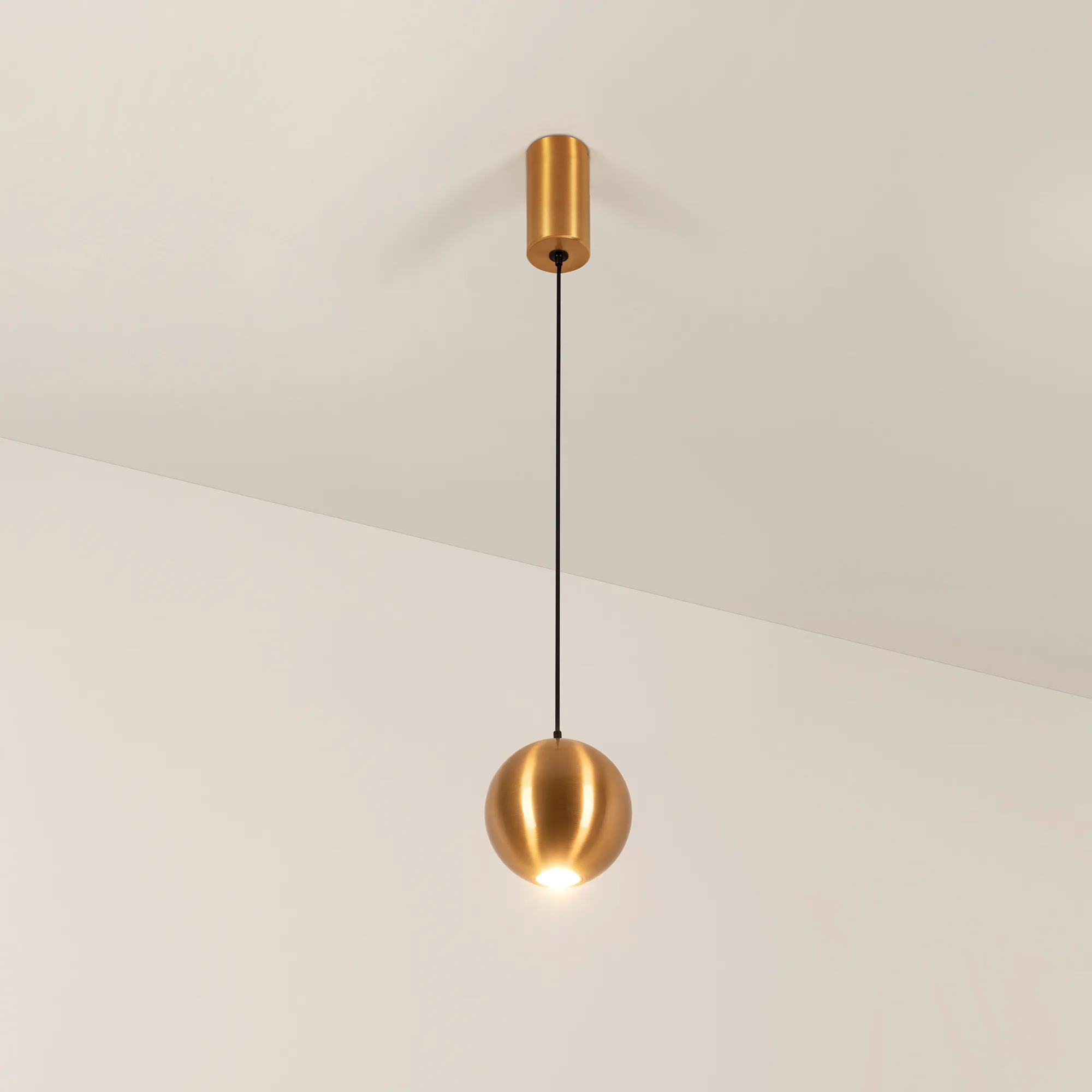 Подвесной светильник. Мощность 9 Вт, св. поток 650 лм, 73 лм/Вт, теплый 3000 K, CRI>80, угол 39°, напряжение питания 230 В. Золотой круглый корпус из алюминия, экран , степень защиты IP40. Размер: диаметр 100 мм, высота 97 мм. Монтаж подвесной, длина подвеса 1500мм, регулируемая. Габариты чаши Ø50x95 мм. Драйвер 28-42 В, 250 мА, пульсация <5%.
