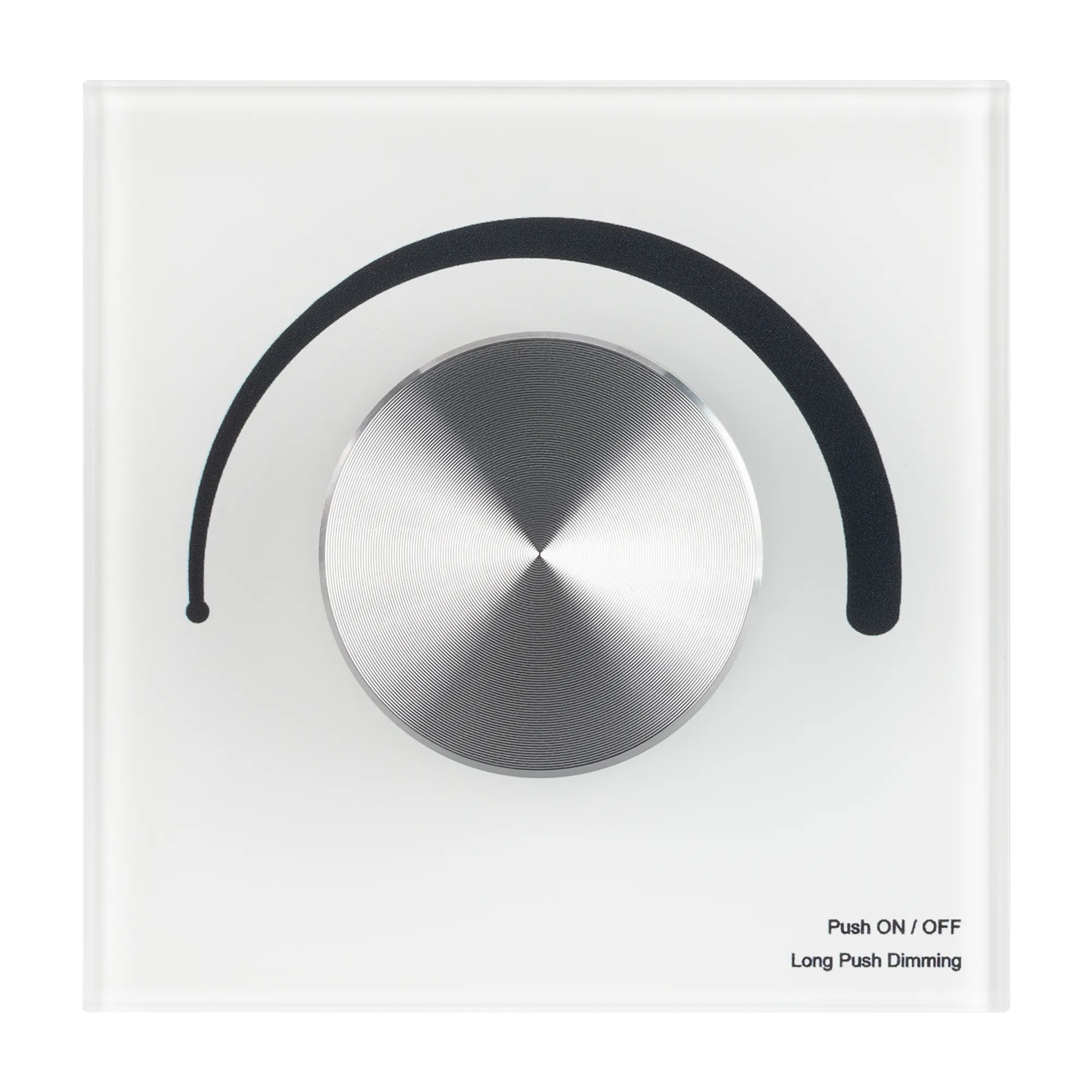 Встраиваемая роторная панель 2.4 ГГц, цвет белый. Материал - стекло/пластик. Для управления одноцветными источниками света (ШИМ). Управление яркостью с помощью роторного вращателя. Питание/рабочее напряжение 3VDC от батарейки CR2032. Габариты 86х86х48 мм. Предназначена для установки в стандартный подрозетник. Панель совместима с диммерами серии SMART.