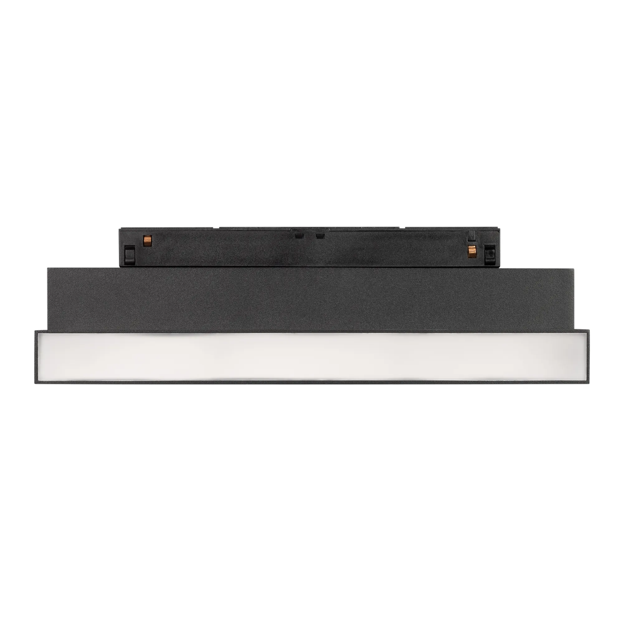 Светильник для магнитных треков MAG-ORIENT шириной 26 мм. Мощность 12 Вт, св. поток 760 лм, 64 лм/Вт, дневной 4000 K, CRI>90, угол 80°, напряжение питания 48 В. Черный прямоугольный корпус из металл, экран поликарбонат, степень защиты IP20. Размер: длина 231 мм, ширина 23 мм, высота 107 мм. Монтаж на трек MAG-ORIENT. Пульсация <1%.