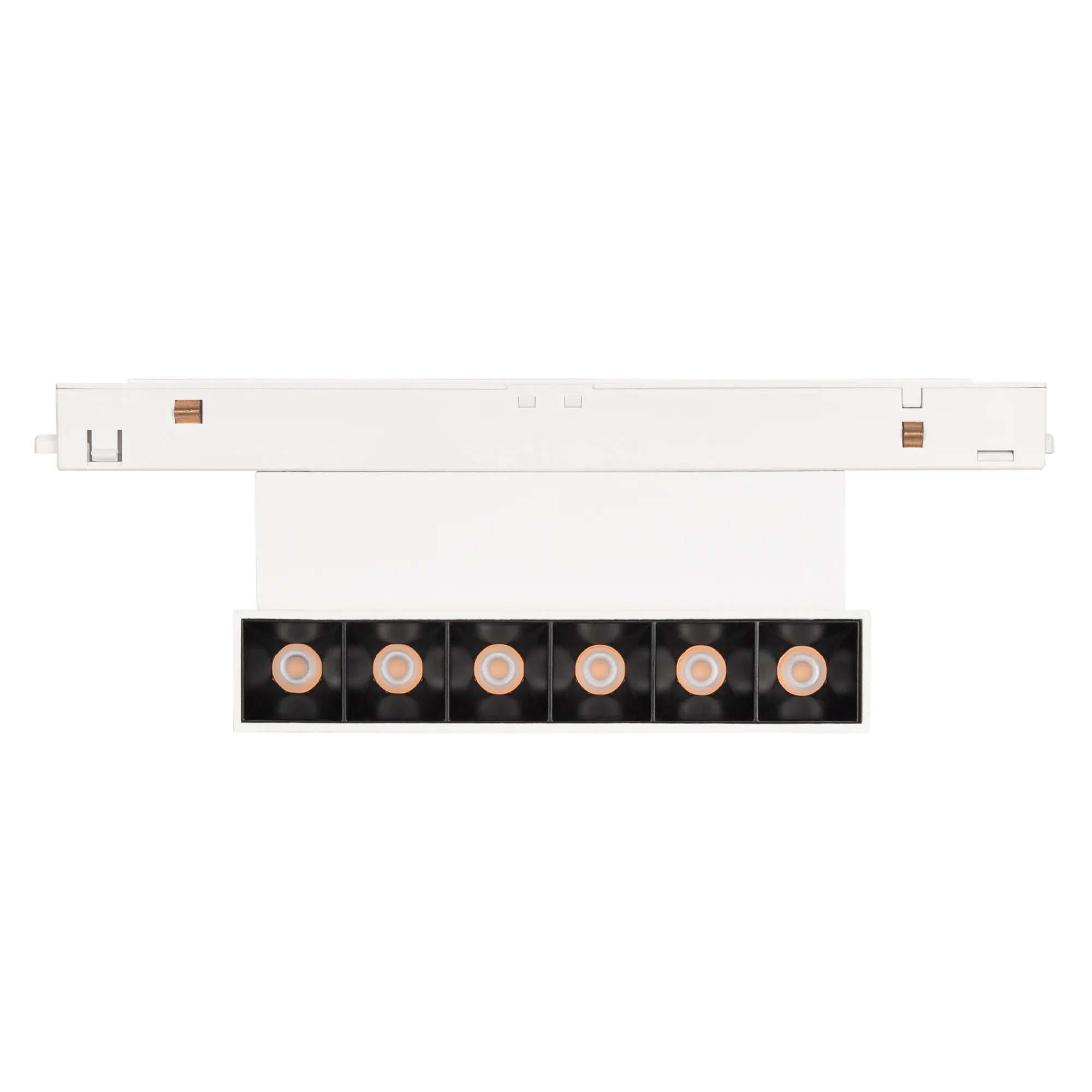 Светильник для магнитных треков MAG-ORIENT шириной 26 мм. Мощность 6 Вт, св. поток 250 лм, 42 лм/Вт, теплый 3000 K, CRI>90, угол 30°, напряжение питания 48 В. Белый прямоугольный корпус из металл, экран поликарбонат, степень защиты IP20. Размер: длина 204 мм, ширина 23 мм, высота 104 мм. Монтаж на трек MAG-ORIENT. Пульсация <1%.