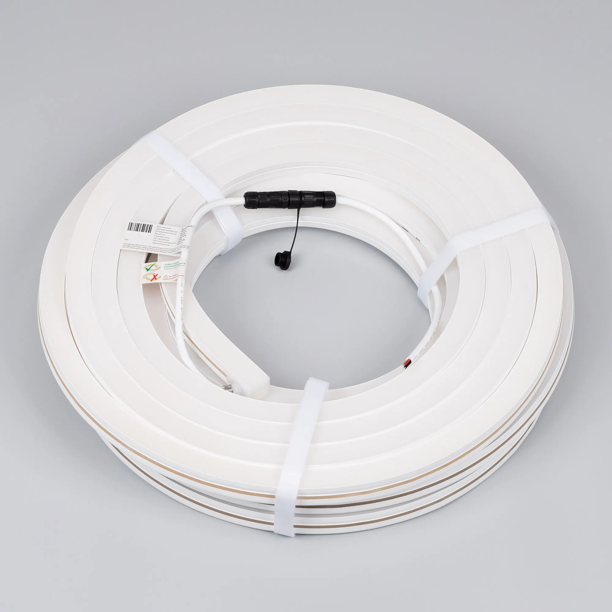 Гибкая герметичная лента (неон серии MOONLIGHT), сечение 20×20 мм. Светодиоды CSP 280 шт/м. Цвет свечения ТЕПЛЫЙ (3500К), индекс цветопередачи CRI>90, световой поток 460 лм/м, угол излучения 114°. Мощность 10 Вт/м, питание 24 В. Класс пылевлагозащиты IP67. Размеры 15000×20×20 мм. Мин. отрезок 50 мм. Горизонтальный изгиб SIDE, минимальный радиус изгиба 180 мм. Катушка 15 м. Цена за 1 м. Гарантия 5 лет.