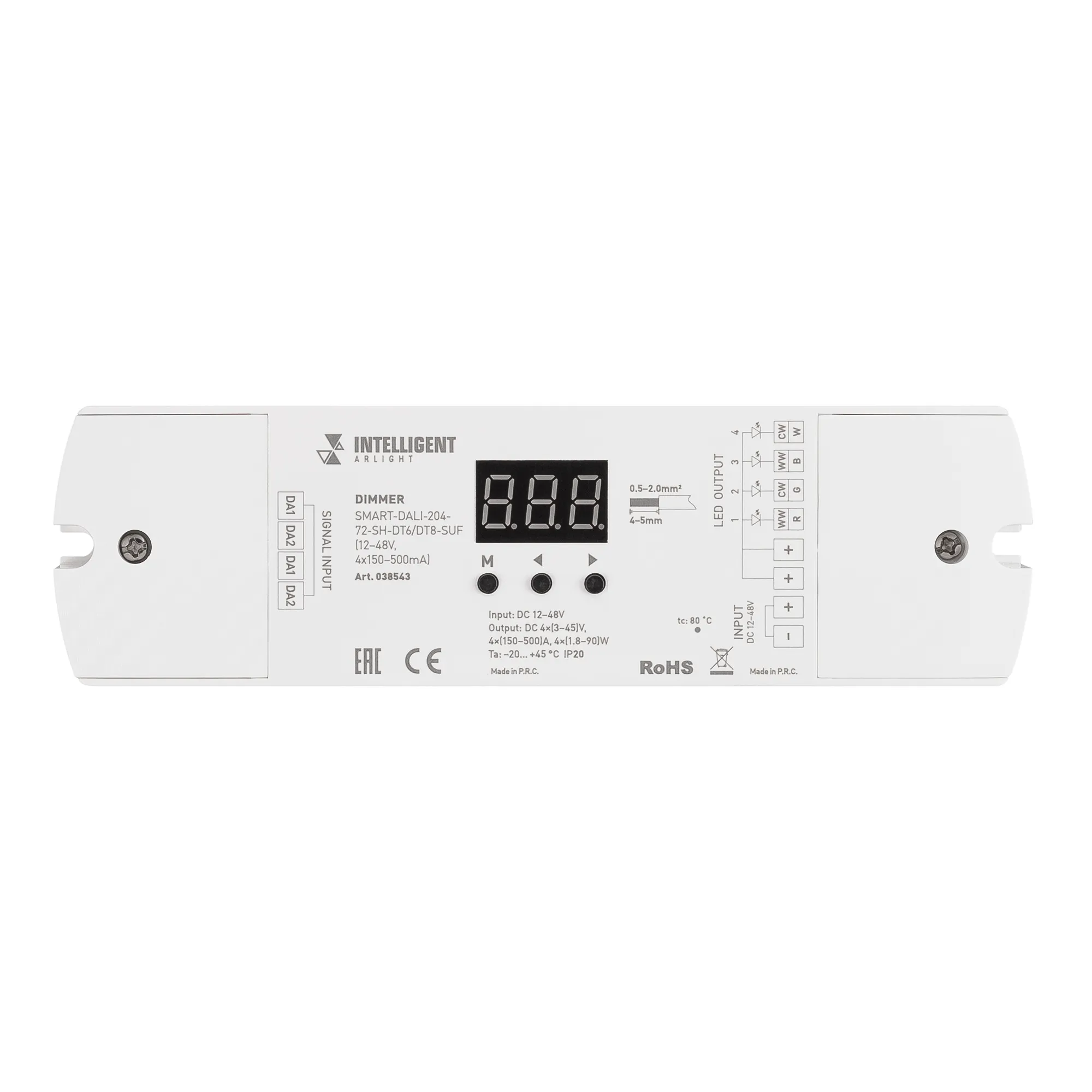 Диммер DALI для светильников. Возможность смены стандарта DALI: DT6/DT8. Питание/вход DC 12-48V, выход DC 3-45V, 4 раздельных канала, 1-4 адреса в DT6, ток нагрузки 4х(150-500mA), максимальная суммарная мощность нагрузки 1.8-90W. Цифровой дисплей и кнопки на корпусе. Изменяемая частота ШИМ 1-8kHz. Размер 170х50х23 мм.