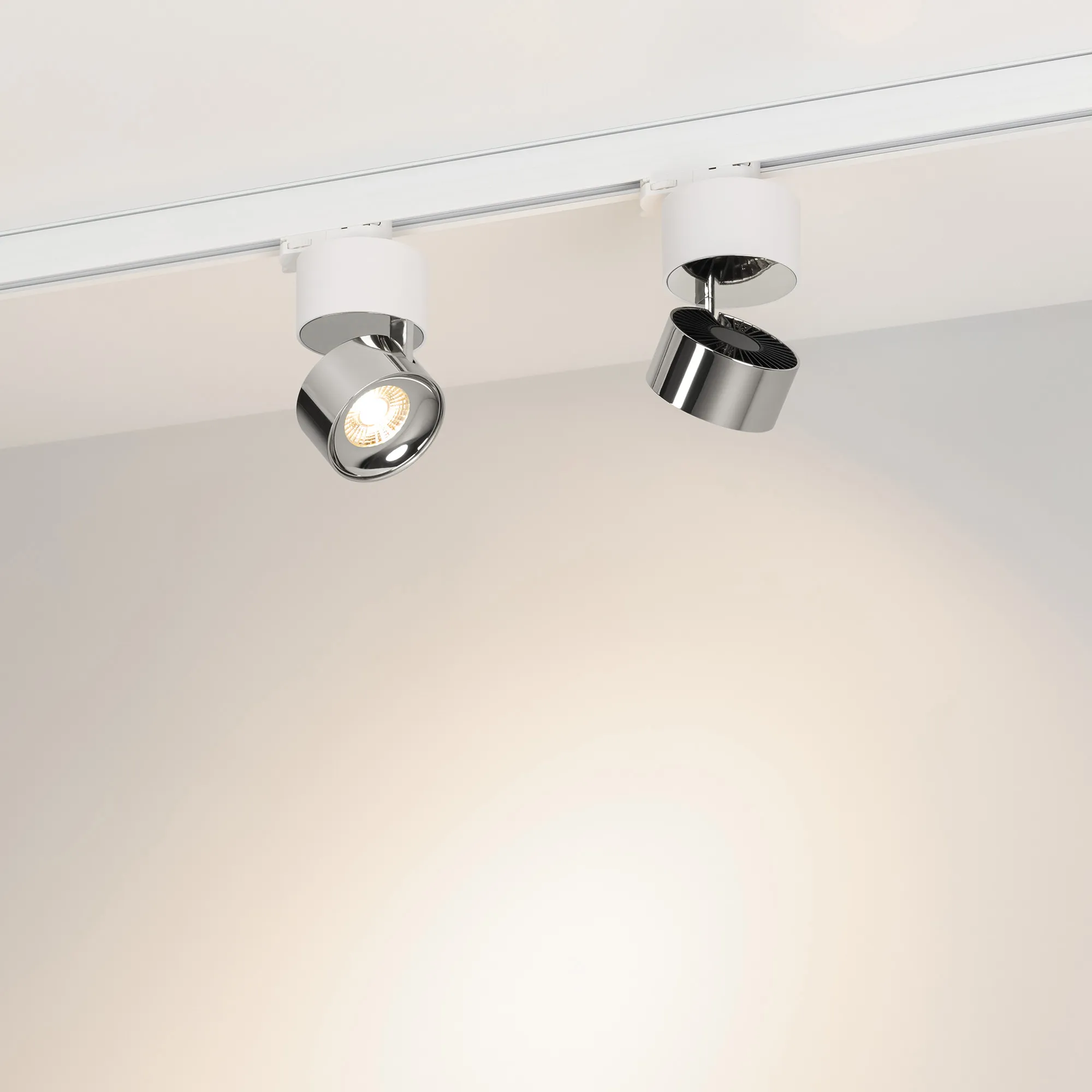 Светильник для треков/шин 4 провода. Мощность 9 Вт, св. поток 580 лм, 64 лм/Вт, дневной 4000 K, CRI>90, угол 36°, напряжение питания 230 В. Модуль цвет хром, белый круглый корпус из алюминия, степень защиты IP20. Размеры корпуса: длина адаптера 86 мм, ширина 32 мм, высота 38,2 мм., высота основания 46 мм. Размер светодиодного модуля: диаметр 77 мм, высота 59 мм. Монтаж на трек 3-фазный. Драйвер 38 В, 200 мА, пульсация <1%.
