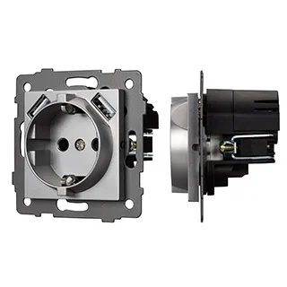 Механизм розетки с заземлением на 1 пост и 2USB Type A порта. Цвет - серый. Без фронтальной рамки. Уровень пылевлагозащиты IP20. Устанавливается в стандартный подрозетник.