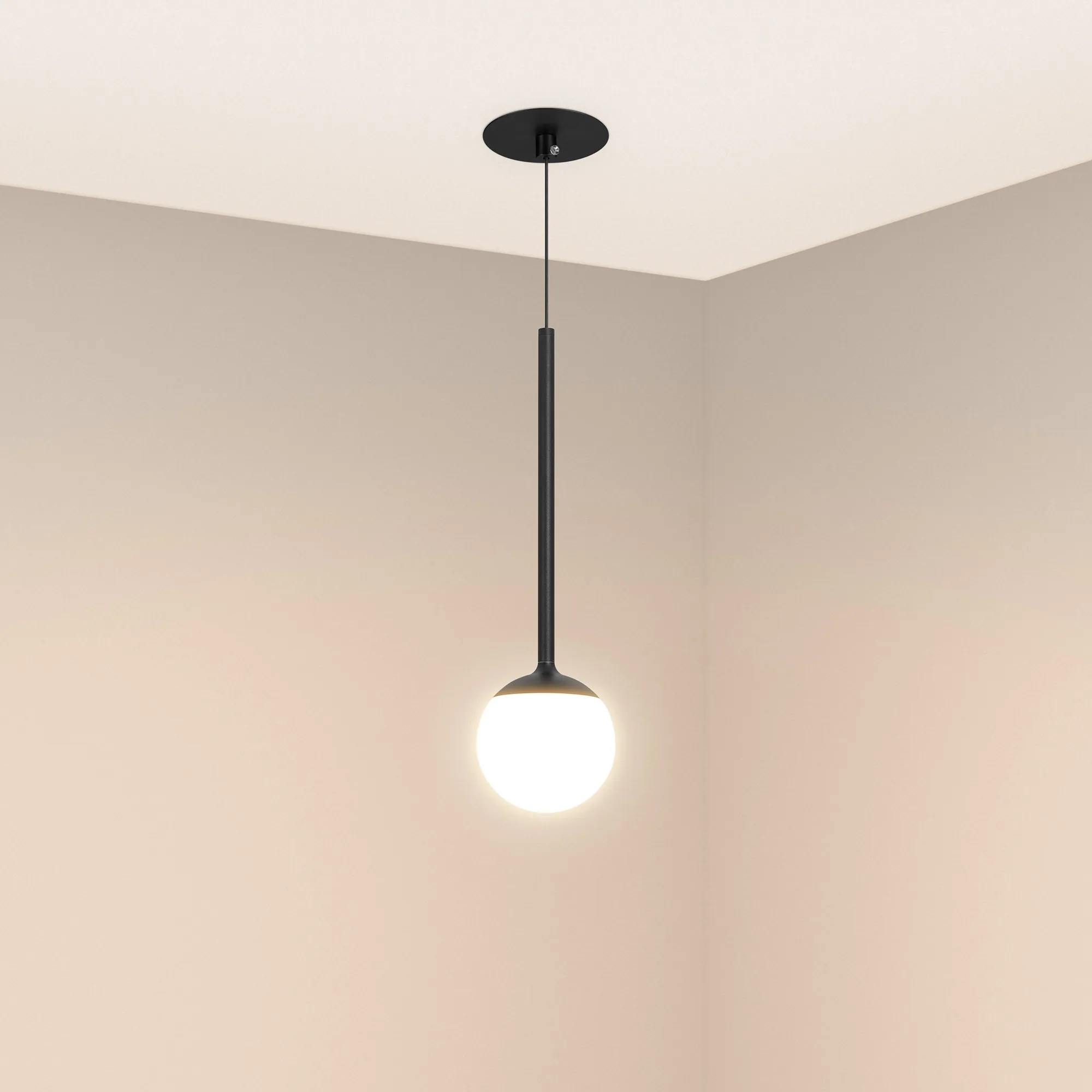 Встраиваемый подвесной светильник. Мощность 8 Вт, св. поток 620 лм, 80 лм/Вт, теплый 3000 K, CRI>90, угол 180°, напряжение питания 230 В. Черный круглый корпус из алюминия и стали, рассеиватель акрил, степень защиты IP20. Размер: диаметр 100 мм, высота ножки 244 мм, длина подвеса 1150 мм. Размеры чаши Ø 92x50 мм, размер врезного отверстия Ø 82 мм. Диаметр провода Ø 4 мм. Монтаж встраиваемый. Драйвер 13-24 В, 300 мА, пульсация <1%.