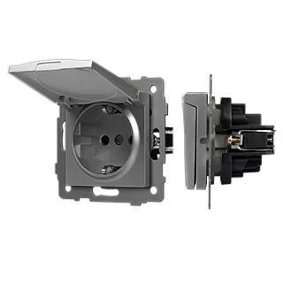 Механизм розетки с заземлением на 1 пост с влагозащитной крышкой. Цвет - серый. Без фронтальной рамки. Уровень пылевлагозащиты IP44. Устанавливается в стандартный подрозетник.