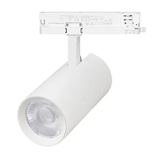 Светильник для треков/шин 4 провода с управлением TRIAC. Мощность 30 Вт, св. поток без решетки honeycomb 3000 лм, 100 лм/Вт, с решеткой honeycomb 1980 лм, 66 лм/Вт, дневной 4000 K, CRI>90, угол 36°, напряжение питания 230 В. Белый круглый корпус из алюминия, материал линзы PMMA, степень защиты IP20. Размер: диаметр 90 мм, длина световой части 141 мм. Монтаж на трек 3-фазный. Драйвер встроенный 24-42 В, 750мА., пульсация <5%