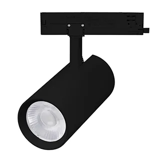 Светильник для треков/шин 4 провода с управлением DALI. Мощность 30 Вт, св. поток без решетки honeycomb 3000 лм, 100 лм/Вт, с решеткой honeycomb 1980 лм, 66 лм/Вт, теплый 3000 K, CRI>90, угол 15°. Черный круглый корпус из алюминия, материал линзы PMMA, степень защиты IP20. Размер: диаметр 90 мм, длина световой части 141 мм. Входное напряжение AC220-240V. Драйвер встроенный 10-42В (300-800 мА), 50/60Гц, максимальная мощность 42W. Монтаж на трек 3-фазный.