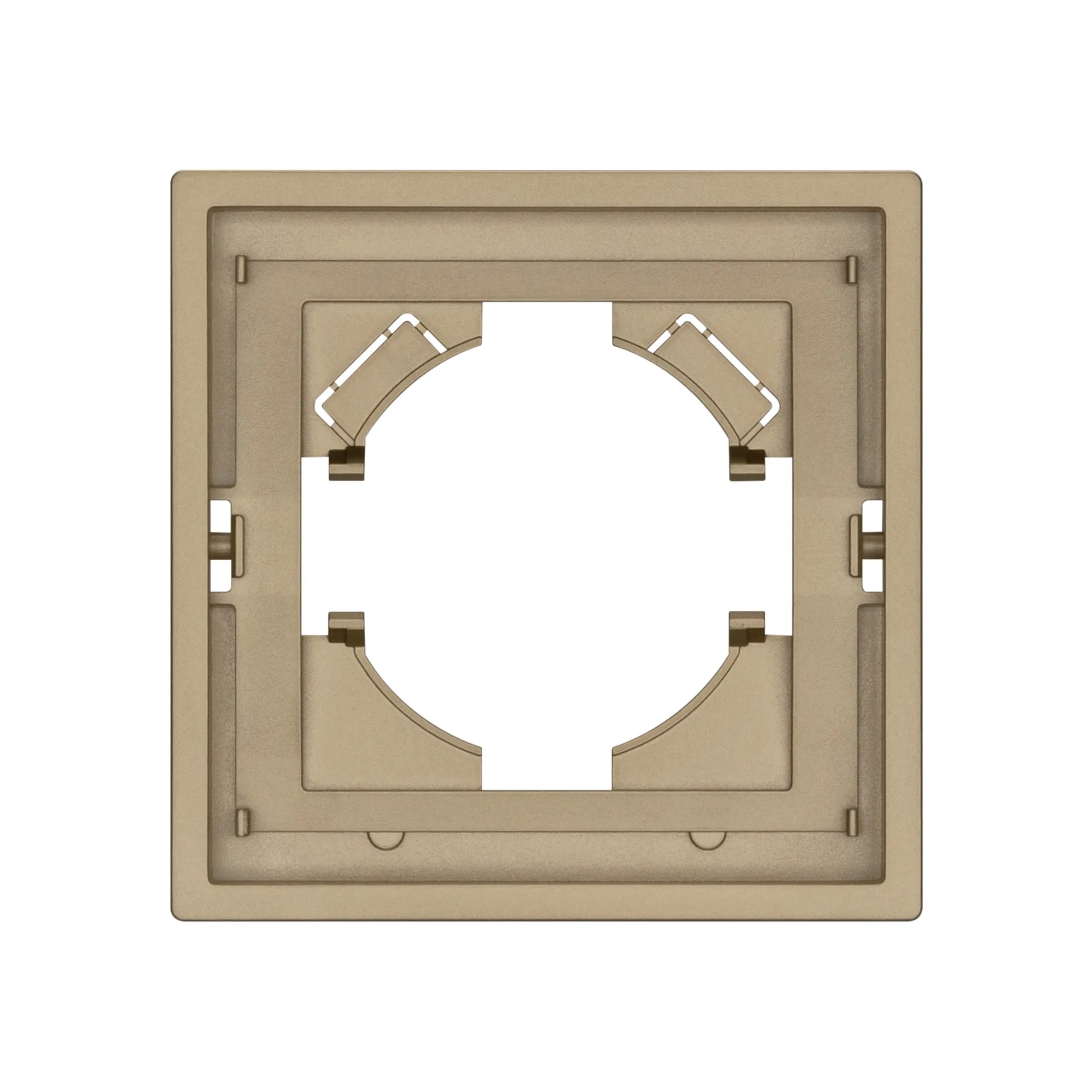 Рамка пластиковая на 1 пост, под встраиваемый механизм. Цвет - золотой, с Soft-Touch покрытием. Среднего уровня герметичности IP20. Ориентация монтажа горизонтальная.