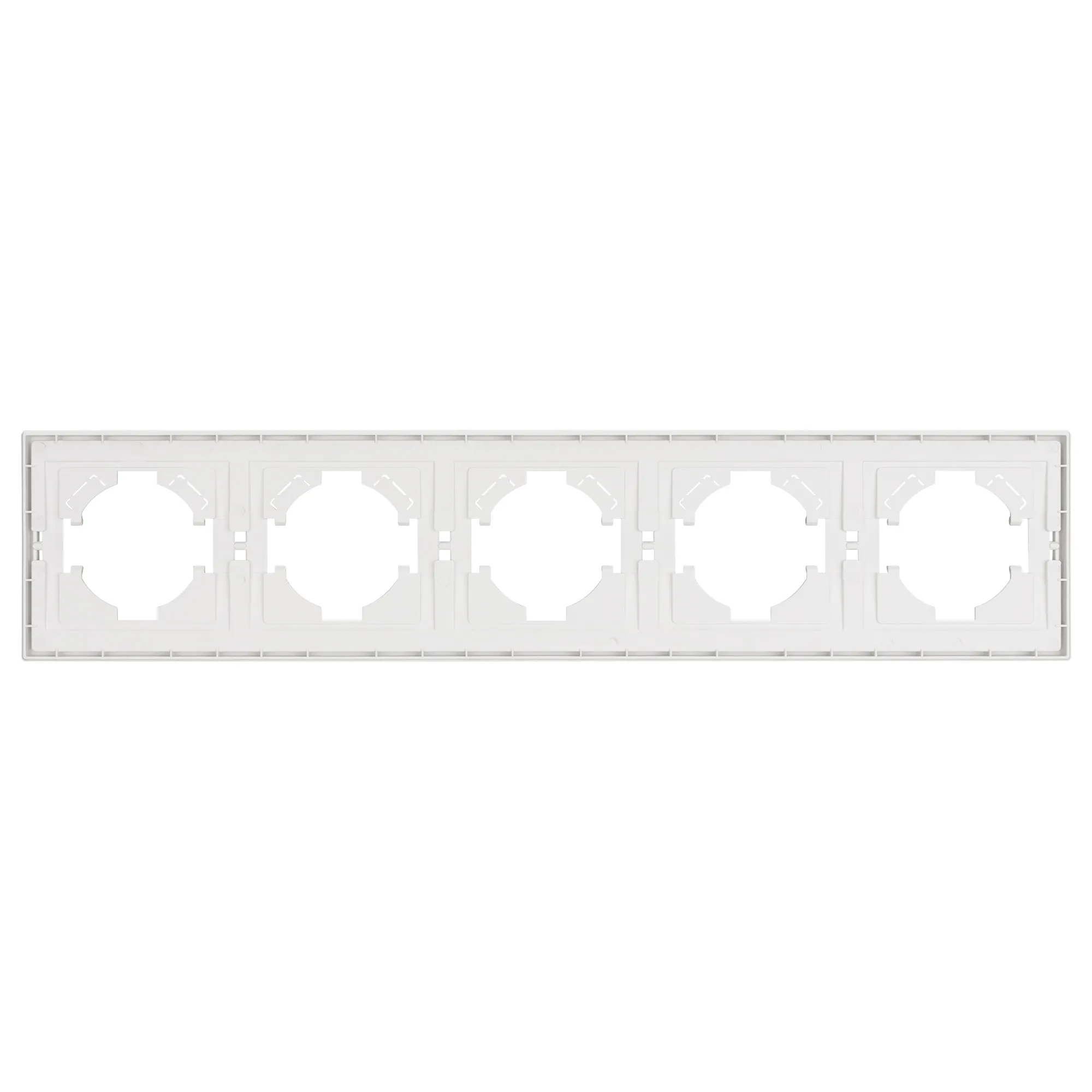 Рамка пластиковая на 5 постов, под встраиваемый механизм. Цвет - белый, с Soft-Touch покрытием. Среднего уровня герметичности IP20. Ориентация монтажа горизонтальная.